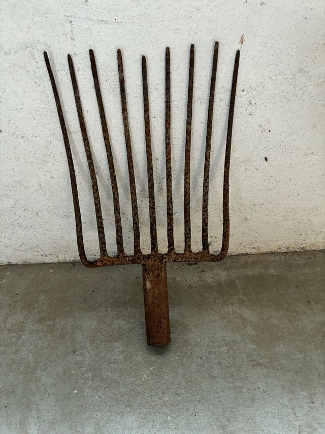 Horquilla de metal con un diseño rústico y oxidado. - Material: Metal. - Color: Óxido.