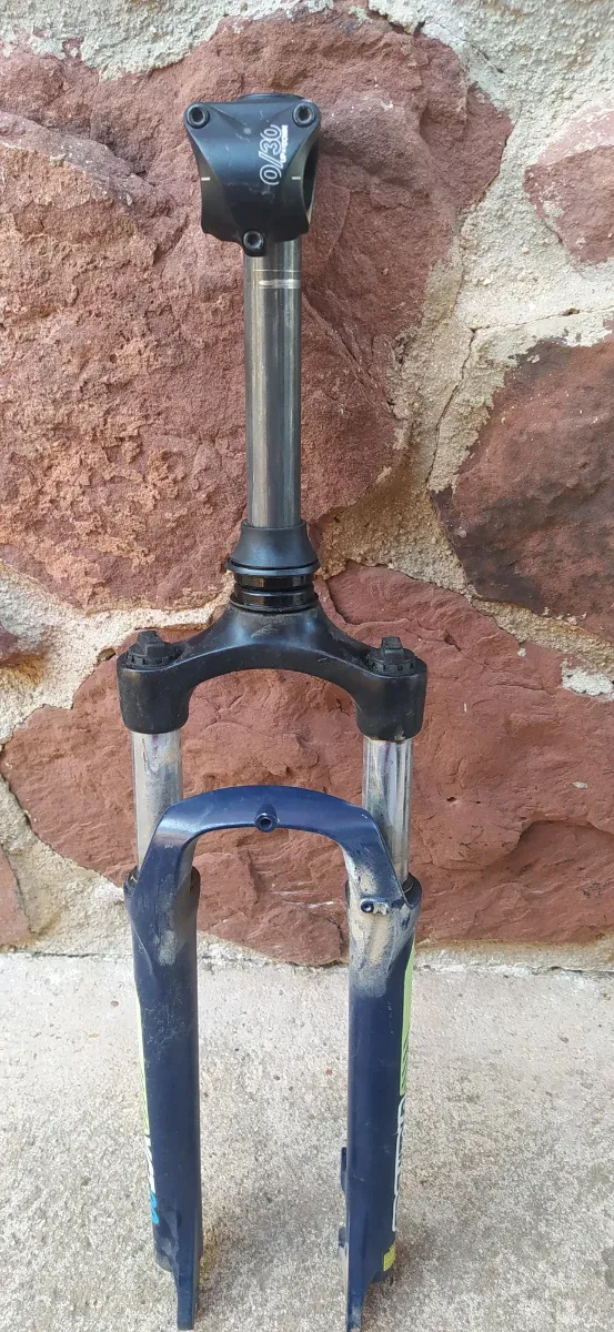 Horquilla delantera para bicicleta de montaña. Con potencia - Tamaño de rueda: 27.5 pulgadas. - Color: Azul y negro.