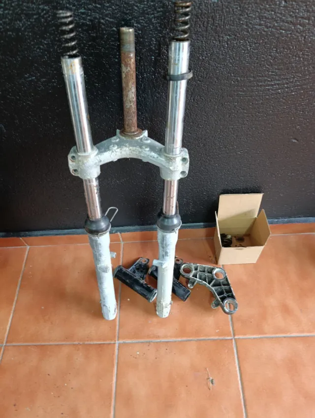 Horquilla completa para Derbi FDX. Incluye las barras, la tija y los muelles. - Barras de horquilla plateadas. - Tija central metálica. - Muelles de suspensión.