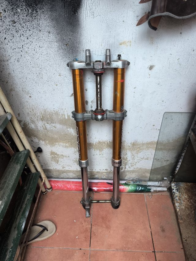 Horquillas invertidas de color dorado, listas para su instalación. - Diseño de horquilla invertida. - Acabado en color dorado.