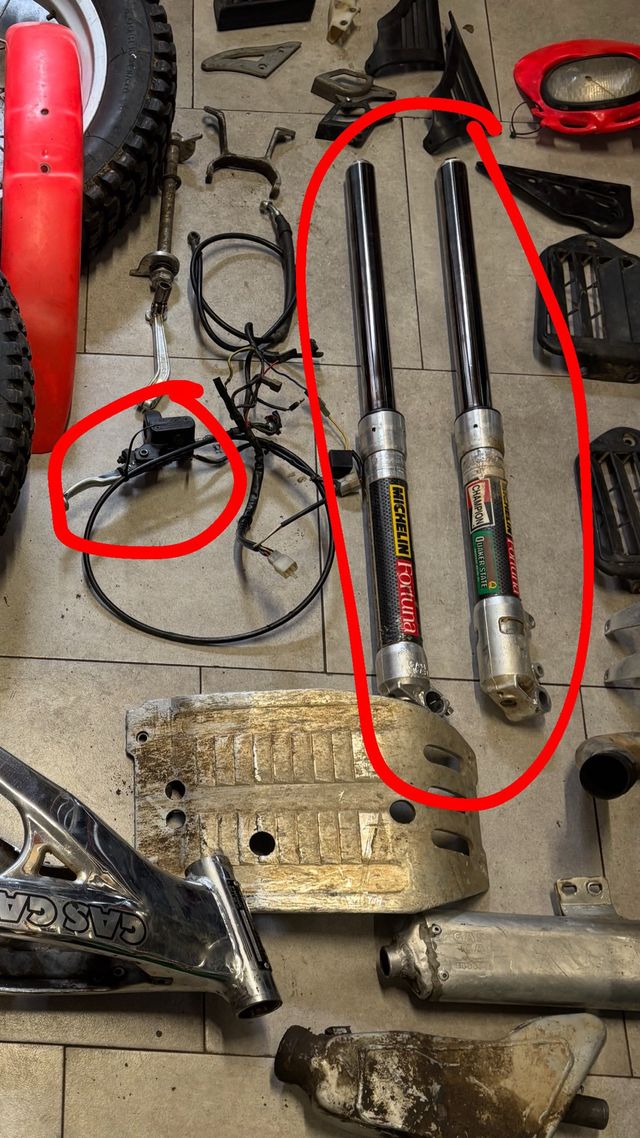 Conjunto de horquillas delanteras y bomba de freno para motocicleta. - Horquillas con amortiguación. - Bomba de freno con maneta.
