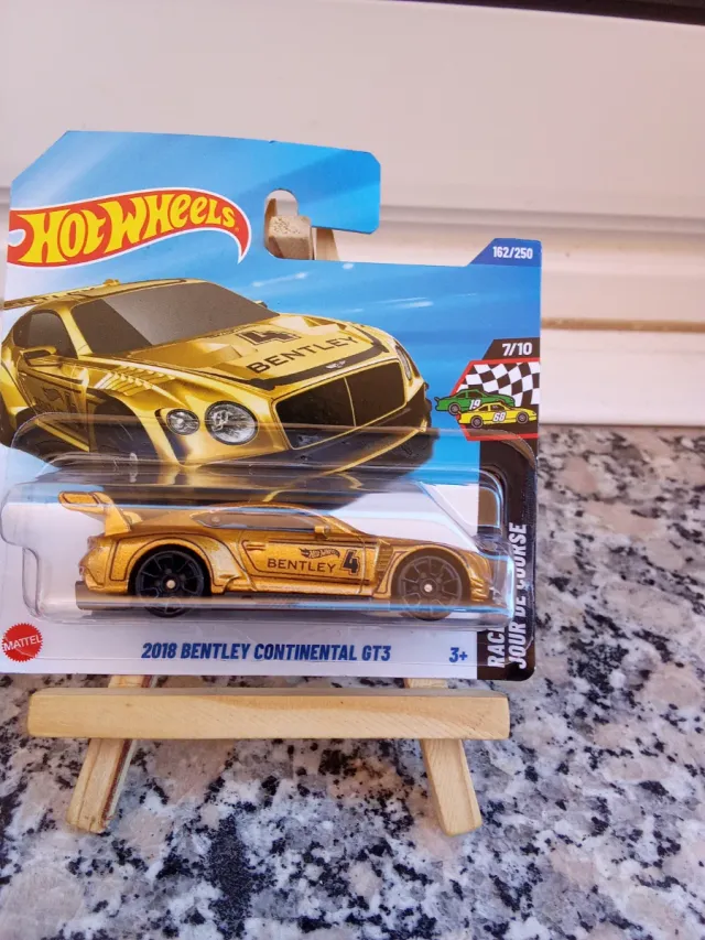 Coche de juguete Hot Wheels modelo 2018 Bentley Continental GT3. - Color dorado. - Diseño de coche de carreras. - Parte de la serie Race Day.