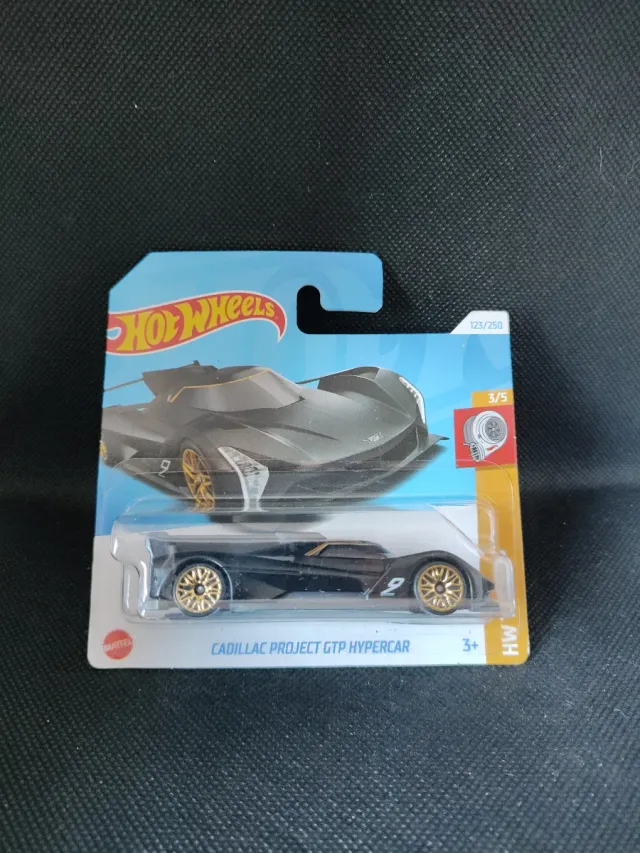Coche de Hot Wheels, modelo Cadillac Project GTP Hypercar. - Color negro con detalles dorados. - Ruedas doradas. - Diseño deportivo.