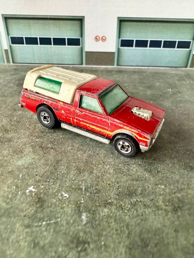 Camioneta Hot Wheels Dodge D 50 de 1982. Metal/Metal - Color rojo con detalles amarillos. - Capota de color crema. - Motor plateado expuesto.