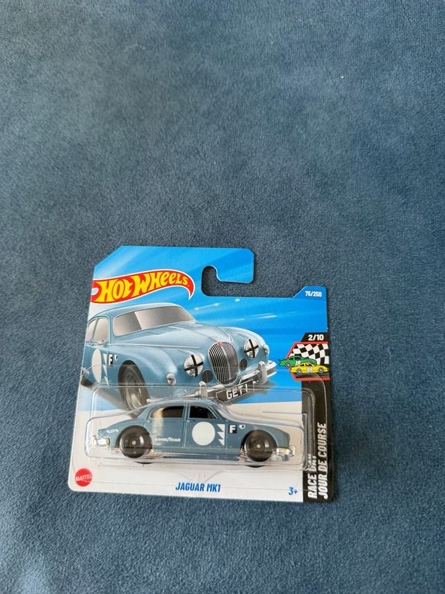 Coche de juguete Hot Wheels, modelo Jaguar MK1 de la serie Race Day. - Color azul. - Escala 1:64. - Número de serie 2/10. - Edición 75/250.