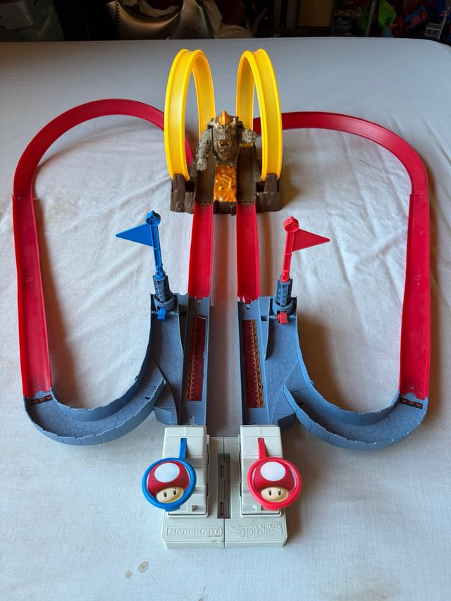 Detalles del productoPista de carreras Hot Wheels Mario Kart con lanzadores dobles y bucles.