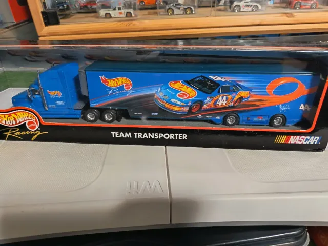 Camión transportador de equipo Hot Wheels Racing. Nascar - Diseño azul con gráficos de carreras. - Incluye un coche de carreras Hot Wheels. - Escala 1:64.