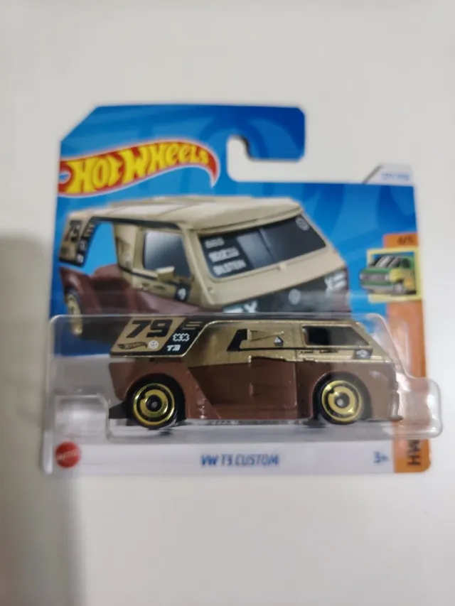 Miniatura de coche Hot Wheels. - Modelo VW T3 Custom. - Diseño en tonos marrón y dorado. - Detalles de carreras y número 79.