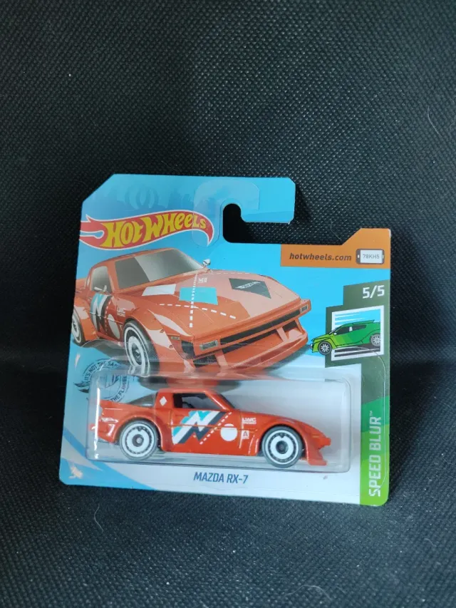 Coche de Hotwheels modelo Mazda RX-7. - Color naranja con detalles gráficos. - Parte de la serie Speed Blur.