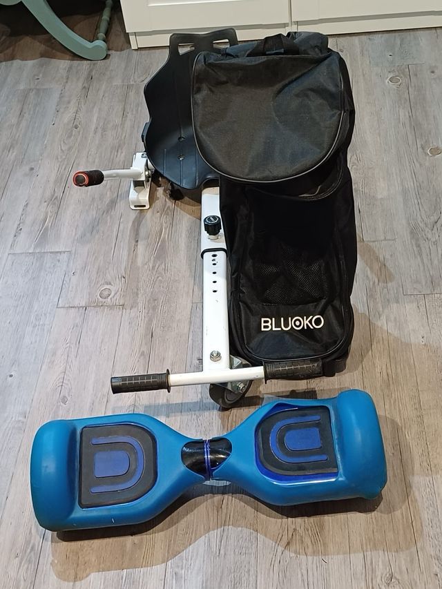 Detalles del productoHoverboard azul con funda negra, protector azul, cargador negro y silla blanca. Tiene algunos arañazos del uso pero funvionan perfectamente. TODO LO RECAUDADO IRA PARA EL VIAJE DE FIN DE CURSO