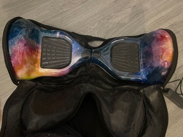 Detalles del productoHoverboard con un diseño de galaxia vibrante y llamativo. Incluye una bolsa de transporte negra.