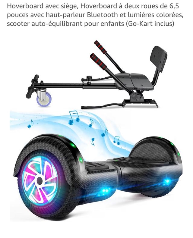 Detalles del productoHoverboard con asiento, ruedas de 6,5 pulgadas, altavoz Bluetooth y luces.
