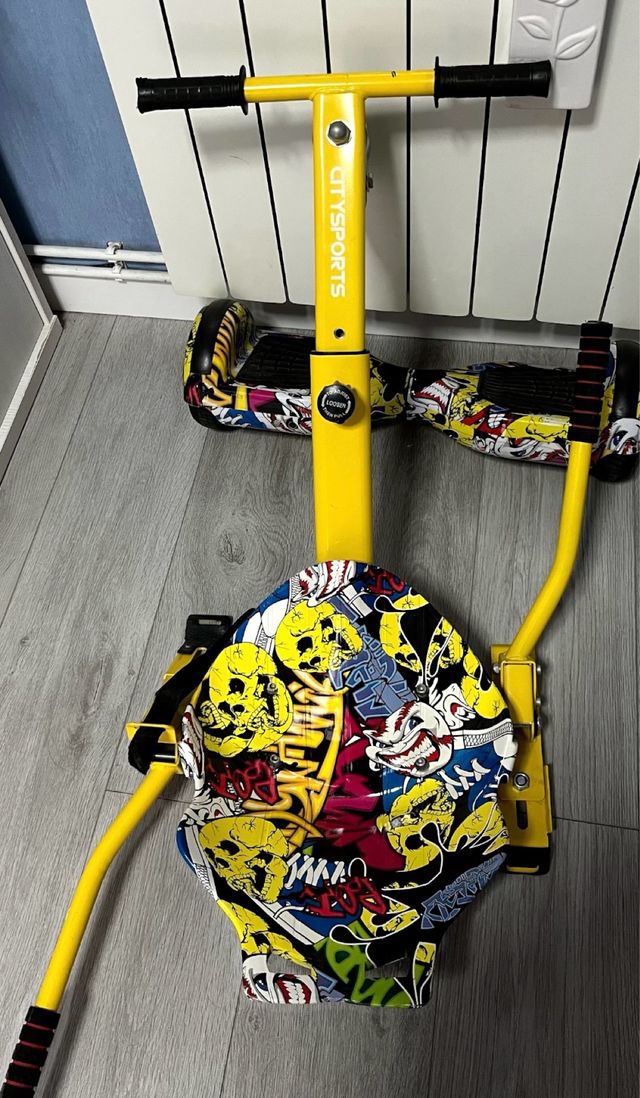 Detalles del productoEste hoverboard se ha convertido en un kart, ideal para divertirse. El asiento y el manillar son de color amarillo brillante y el diseño del asiento es muy llamativo con calaveras y grafitis.