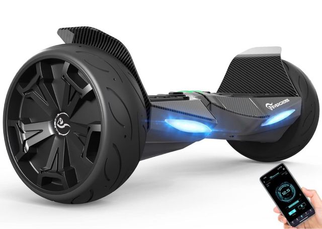 Hoverboard moderno con un diseño elegante y futurista. Ideal para desplazamientos urbanos. - Acabado en carbono. - Luces LED azules. - Conexión a app móvil.