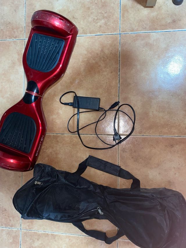 Detalles del productoHoverboard de color rojo brillante, ideal para desplazarse de forma divertida. Incluye su cargador y un bolso para transportarlo.