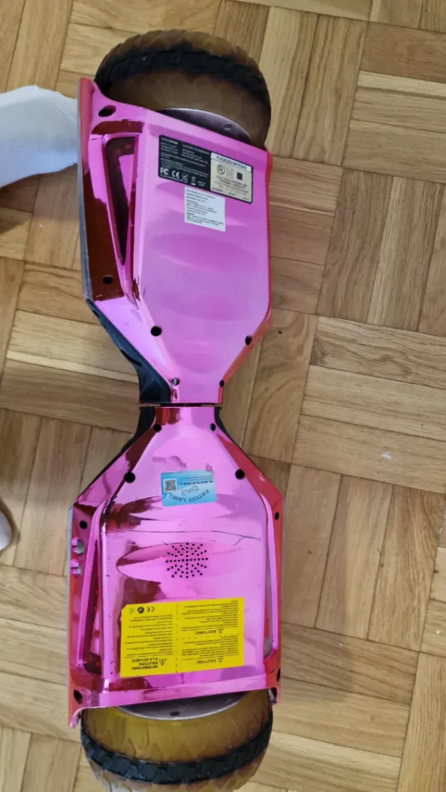 Hoverboard de color rosa brillante con ruedas. - Carcasa metálica. - Ruedas de goma. - Diseño moderno.