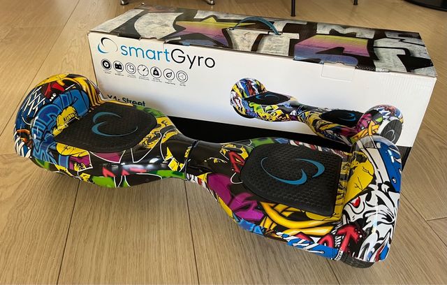 Hoverboard Smart Gyro con un diseño vibrante de graffiti. - Ruedas con luces LED. - Altavoces Bluetooth integrados. - Luces LED frontales.