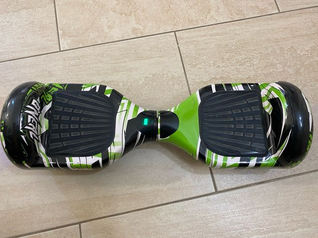 Detalles del productoHoverboard con un diseño llamativo en verde, negro y blanco.