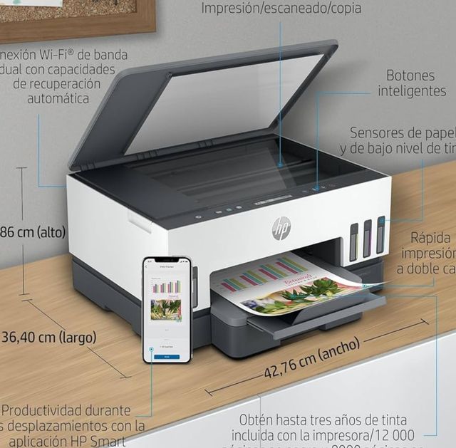 Detalles del productoHP Smart Tank 7005 28B54A - Impresora A4 Multifunción con Deposito de Tinta Recargable, Impresión a Color, Escaner, Copiadora, Wi-Fi, HP Smart App, Blanca y Gris Oscuro