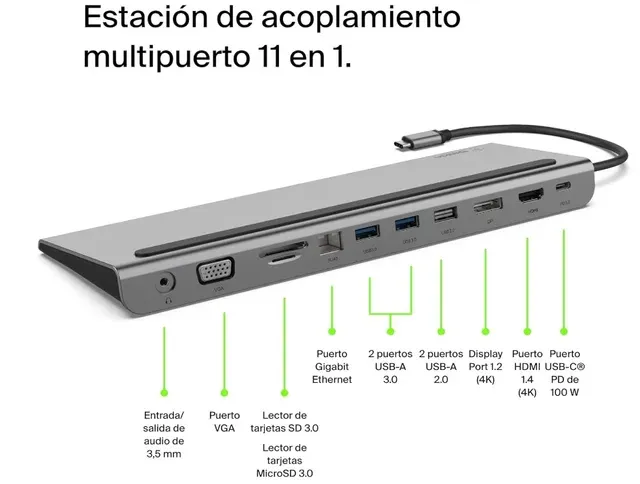 Detalles del productoEstación de acoplamiento multipuerto Belkin 11 en 1. Diseño elegante en color gris.