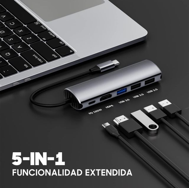 “Un HUB USB-C 5 en 1 simplifica tu vida digital al convertir un puerto en múltiples conexiones útiles: HDMI, USB 3.0, lector de tarjetas SD/microSD y carga passthrough. ¡Más espacio, más productividad!”