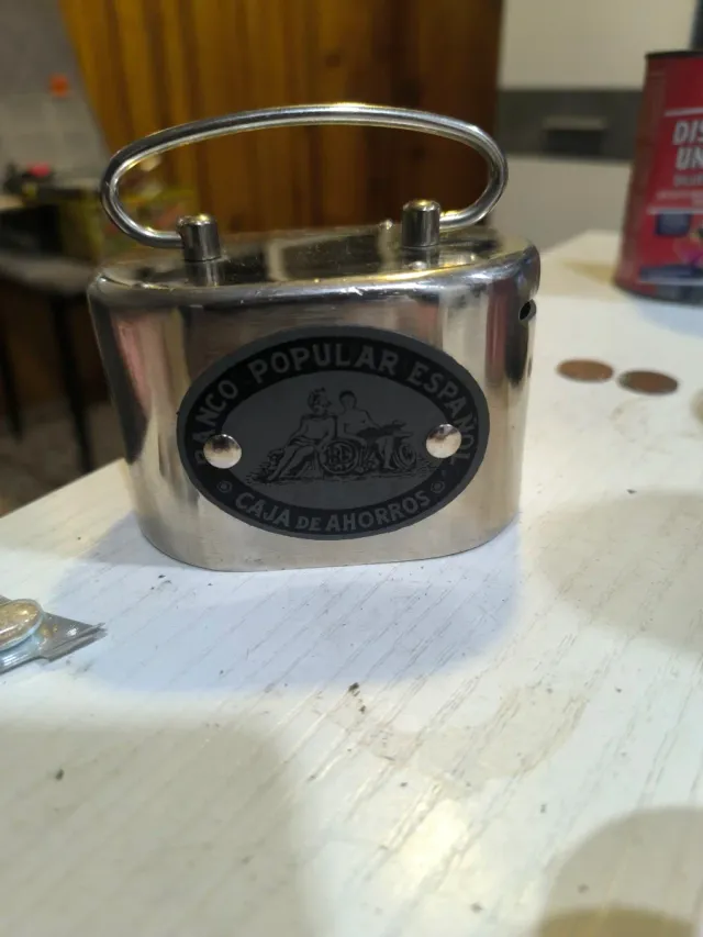 Hucha metálica con el emblema del Banco Popular Español, con numeración 138653 - Diseño vintage. - Asa superior. - Grabado Caja de Ahorros.