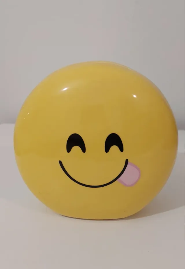 Detalles del productoHucha divertida con diseño de emoji sonriente sacando la lengua. Ideal para guardar tus ahorros con un toque de alegría.