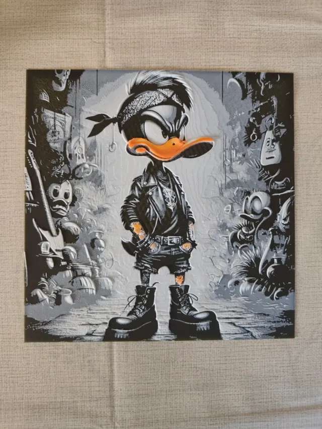 Detalles del productodiseño exclusivo de un pato rockero con ropa de cuero, botas y tatuajes, en un ambiente urbano. Se enfatiza la técnica Hueforge por su detalle y relieve, la calidad premium del material, sus dimensiones ideales para decoración (20x20cm) y su originalidad como regalo.