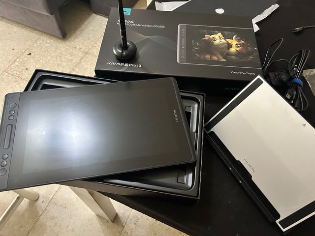 Detalles del productoTableta gráfica Huion Kamvas Pro 13, ideal para artistas digitales. Incluye el lápiz y su soporte.