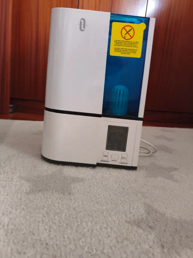 Humidificador de aire con un diseño moderno en blanco y azul. - Depósito de agua translúcido. - Panel de control digital. - Filtro interior.