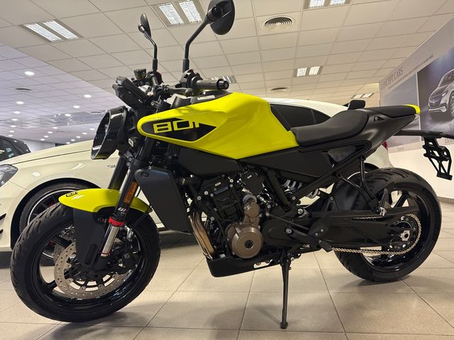 Motocicleta Husqvarna Vitpilen 801 del año 2025. Diseño moderno y deportivo. - Estilo naked. - Transmisión manual. - Combinación de colores negro y amarillo.