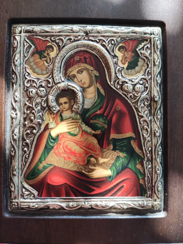 Detalles del productoIcono religioso de estilo bizantino que representa a la Virgen María con el Niño Jesús.