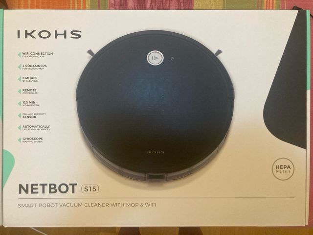 Detalles del productoRobot aspirador IKOHS Netbot S15 usado, pero en perfecto estado. Incluye mando a distancia, base de carga y todos los accesorios y repuestos por estrenar: cepillos, filtros, paños para fregar el suelo...