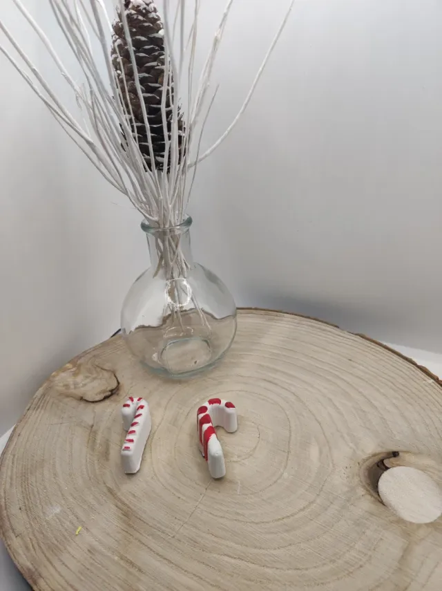 Imanes decorativos con forma de bastones de caramelo, perfectos para darle un toque navideño a tu hogar. - Diseño de bastón de caramelo. - Colores rojo y blanco.