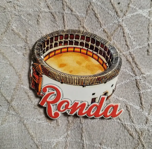 Imán con diseño de la plaza de toros de Ronda. - Representación de la plaza de toros. - Inscripción Ronda en relieve.