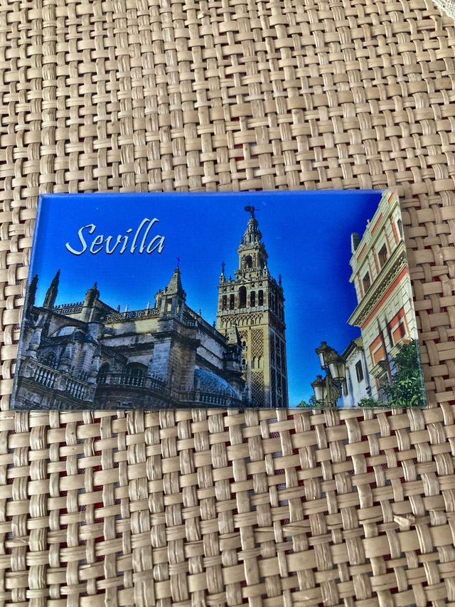 Recuerdo de Sevilla con una imagen de la Catedral y la Giralda. - Diseño con el nombre Sevilla en blanco. - Representación de la arquitectura de la ciudad.