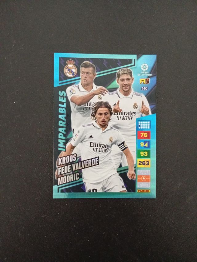 Detalles del productoColección de cromos de LaLiga Santander de la temporada 2022-23. Incluye a los jugadores Kroos, Fede Valverde y Modric del Real Madrid.
