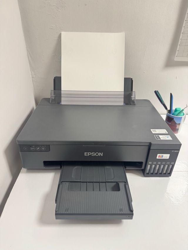 Detalles del productoImpresora de sublimación Epson EcoTank ET-18100. A3. en color gris. Para sublimación, calidad fotográfica. Tiene solo 5 meses de uso, los depósitos son los primeros que se llenaron y tengo los 5 botes de tinta que traía más de la mitad.
