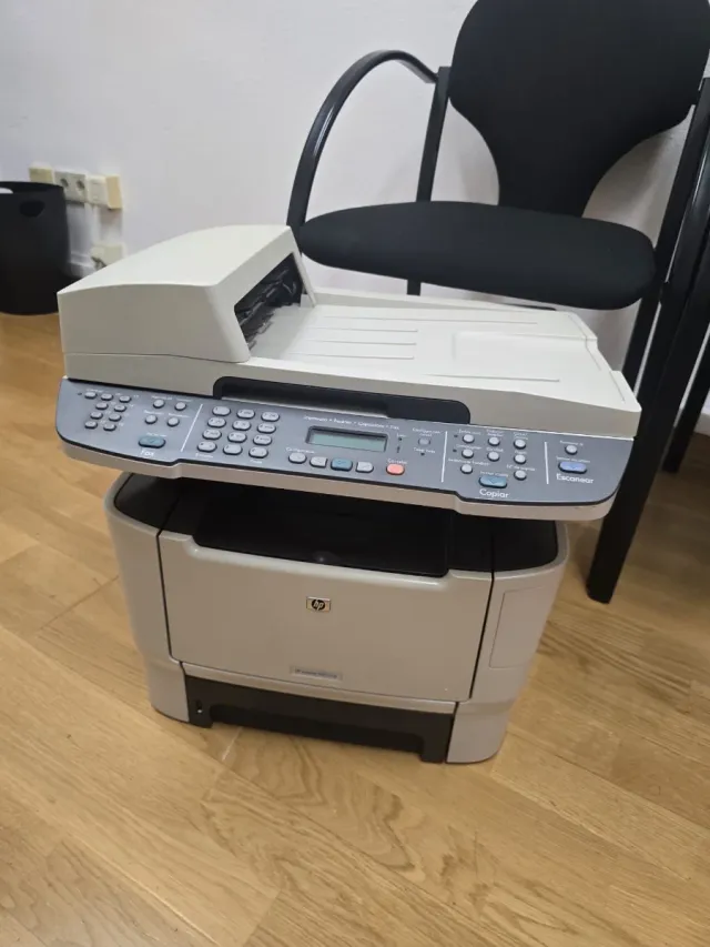 Impresora multifunción HP en color gris y blanco. Este equipo combina funciones de impresión, escaneo y fax. - No incluye el cable de alimentación.
