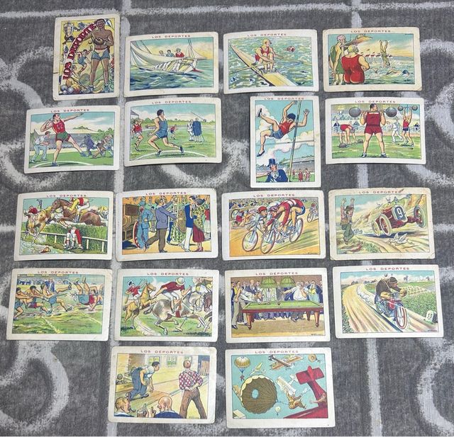 Detalles del productoColección de 18 cromos antiguos de la serie Los Deportes 1920 Cada cromo representa una escena deportiva diferente.