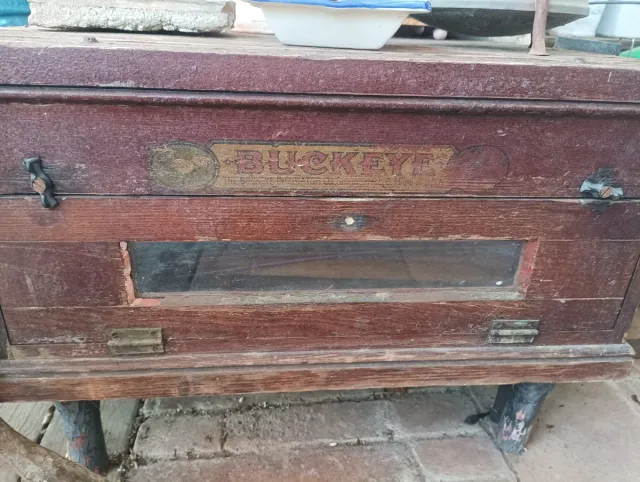 Detalles del productoIncubadora antigua de madera con la marca Buckeye visible.