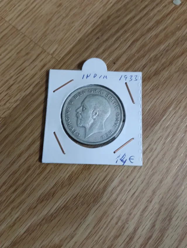 Moneda de plata de la India de 1933, con la efigie de Jorge V. - Reverso: INDIA y 1933 - Anverso: GEORGIVS V DEI GRA BRITT OMN REX - Tipo: Half Crown