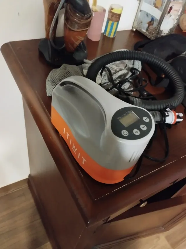 Inflador eléctrico ITIWIT de 12V, diseñado para tablas de paddle surf. - Color gris y naranja. - Pantalla digital. - Manguera negra corrugada.
