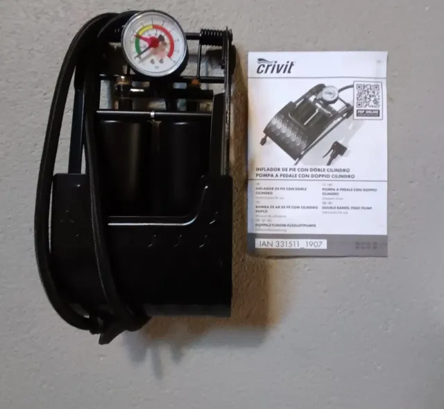 Detalles del productoInflador de pie Crivit con diseño de doble cilindro. Incluye manómetro para controlar la presión.