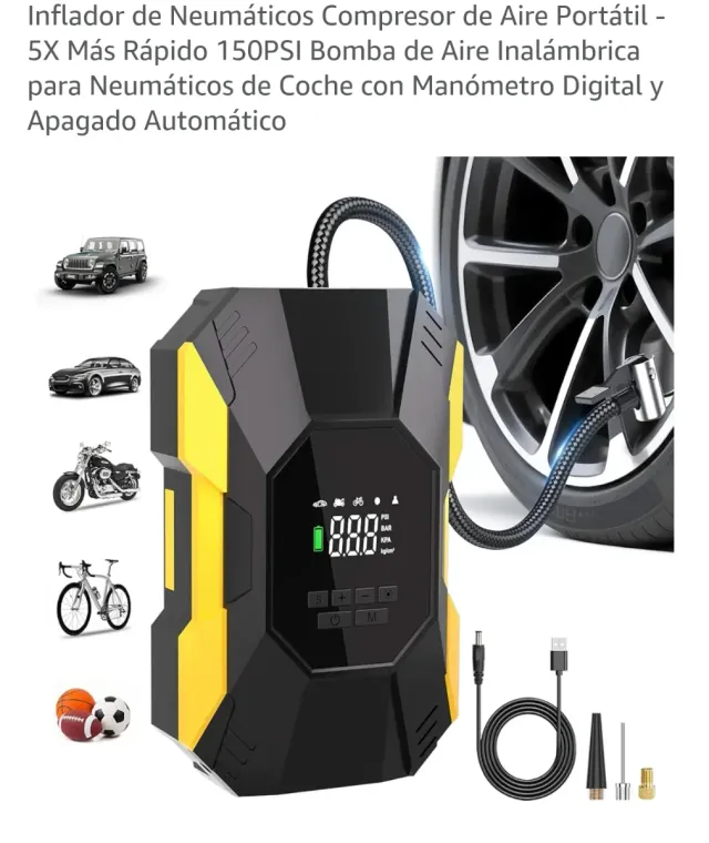 Detalles del productoInflador de neumáticos portátil con compresor de aire inalámbrico.