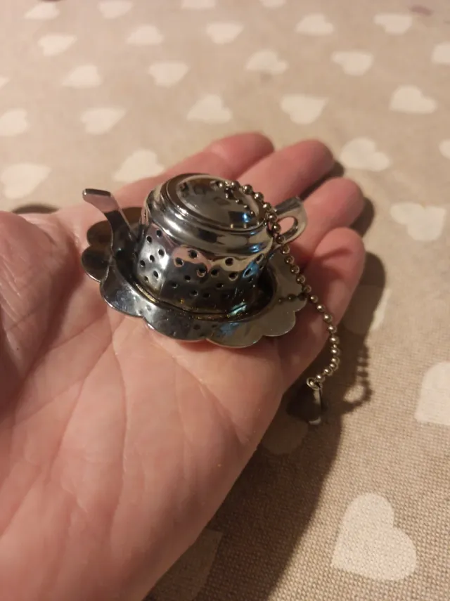 Infusor para té y otras infusiones de acero inoxidable con forma de tetera y platito para posarlo. Cadenita para poder sacarlo de la taza. Sólo 1€.