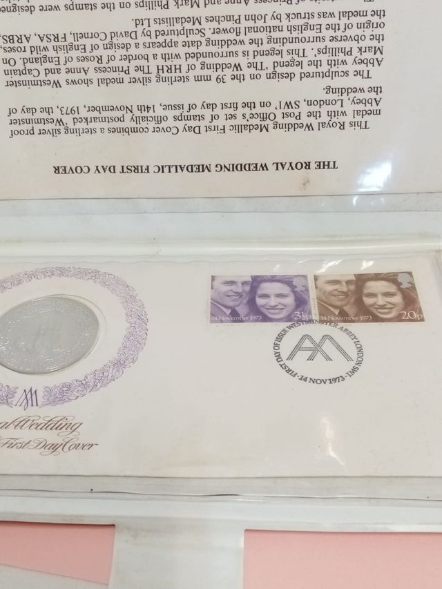 Detalles del productoInglaterra, boda real de la princesa Anna, 14 de Noviembre de 1973, con dos sellos diferentes conmemorativos, celebrando el acontecimiento, y una moneda de plata, tamaño de una onza, en proof, con carpeta original, 38 euros.