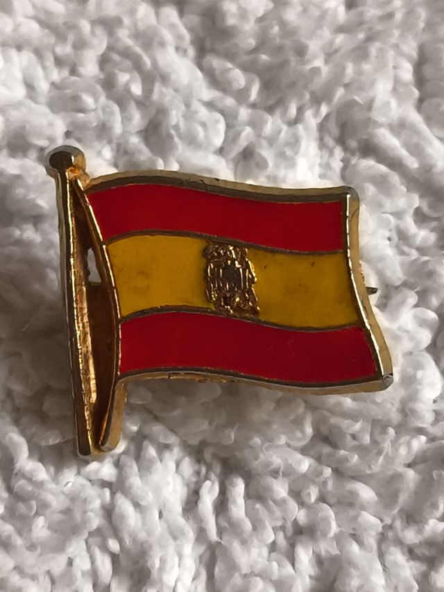 Detalles del productoInsignia de imperdible de solapa con la bandera de España, esmaltada con los colores clásicos de la misma y en el centro el antiguo escudo del año 1975 aunque este último ha perdido algo de nitidez por estás guardado con otros artículos. Es un artículo pequeño y ligero, ideal para coleccionistas.
