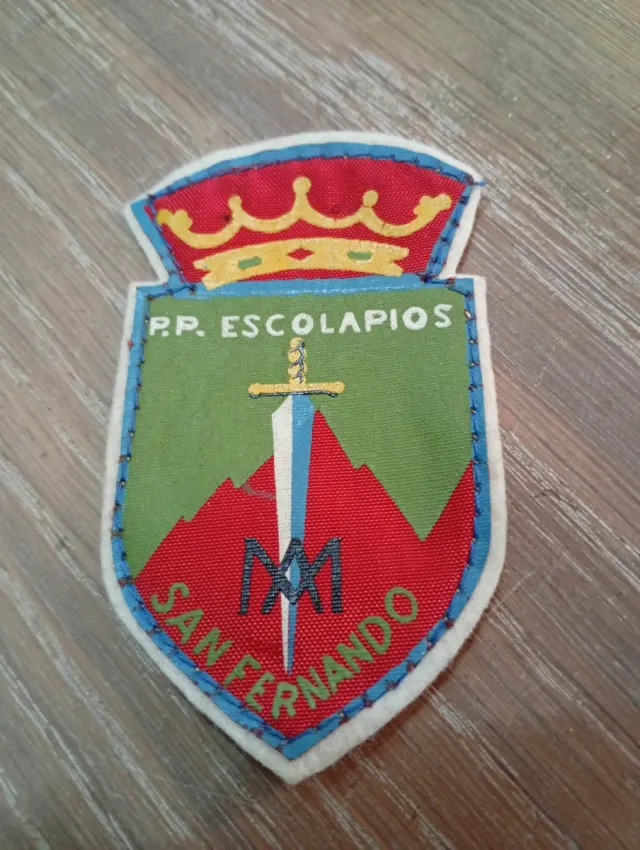 Insignia bordada de los Escolapios de San Fernando. - Diseño con corona, espada y montañas. - Texto P.P. ESCOLAPIOS y SAN FERNANDO. - Bordes festoneados.