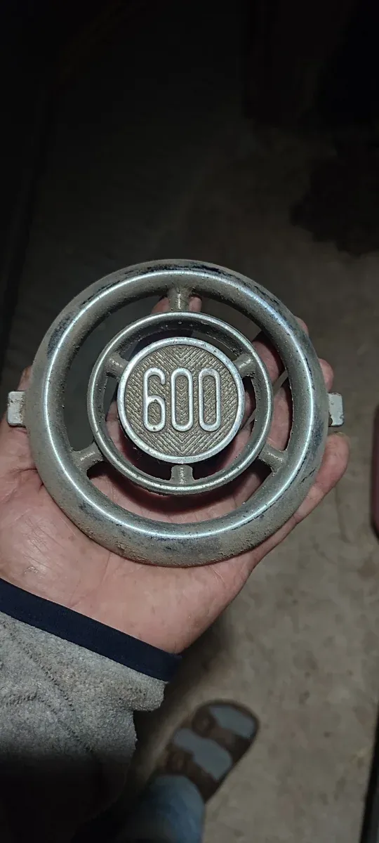 Insignia metálica con el número 600, original de un Seat 600. - Diseño circular con detalles. - Acabado plateado.